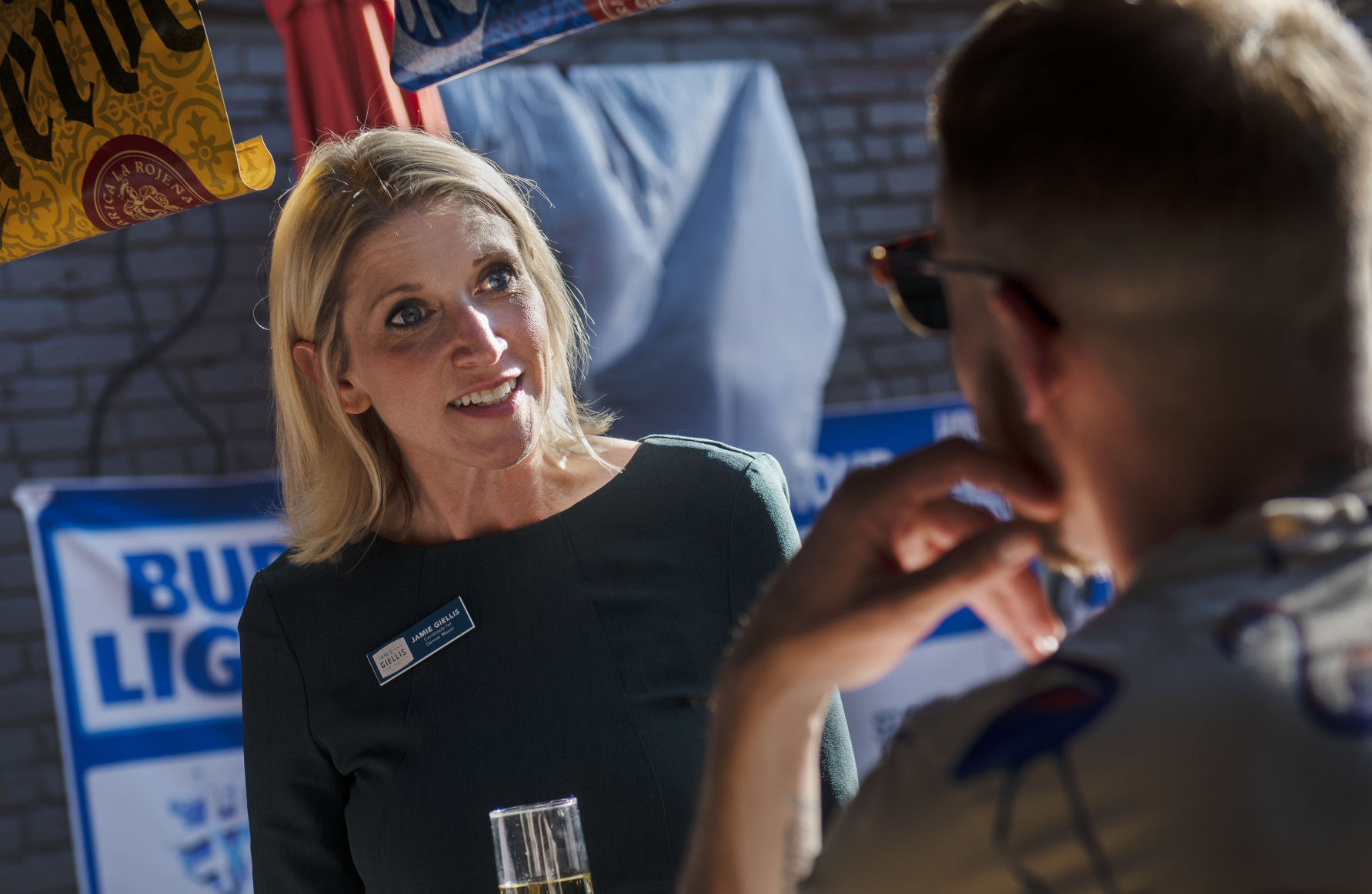 Denver mayoral candidate Jamie Giellis chats with a patron at the bar. Her campaign’s antique yellow school bus — a donated 1970s model — sits parked outside.