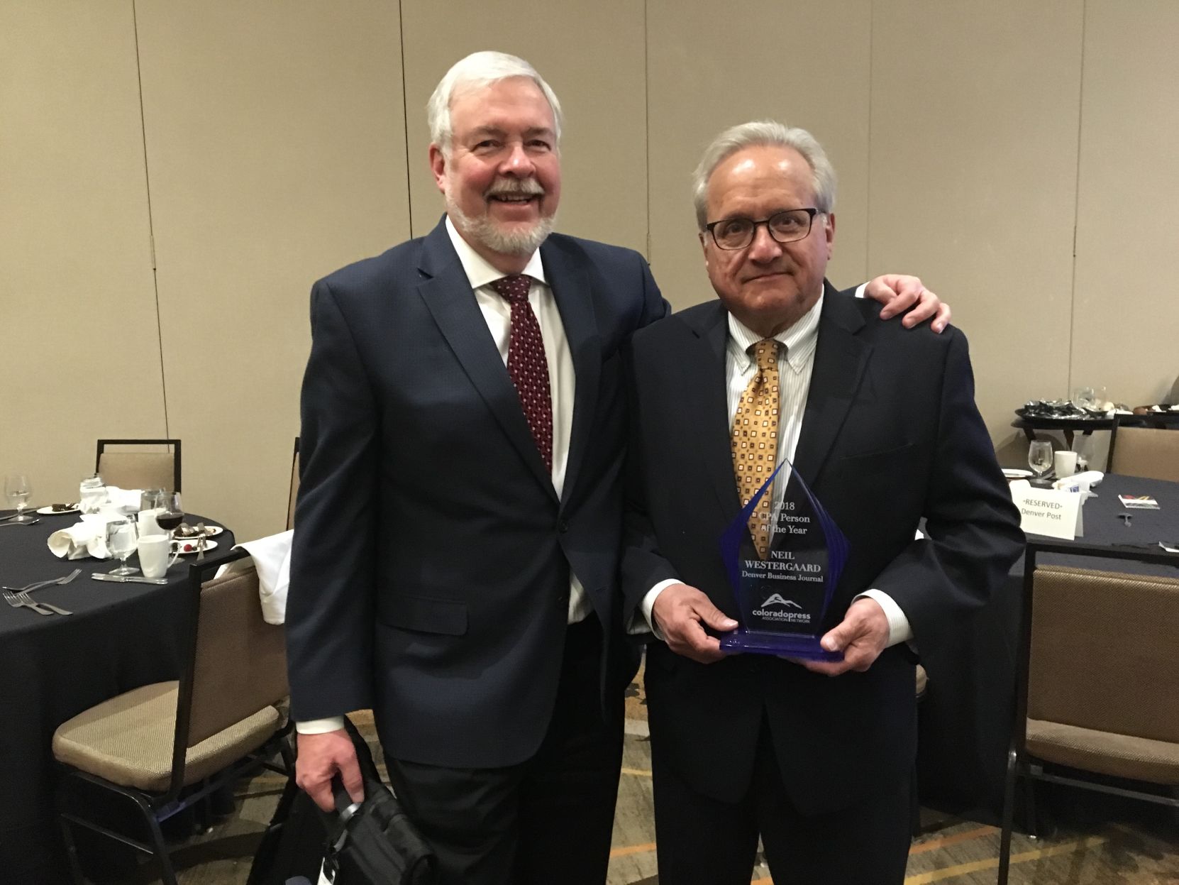 Colorado Politics Managing Editor Mark Harden, who was hired by Westergaard at the Business Journal and the Post, presented the honor.