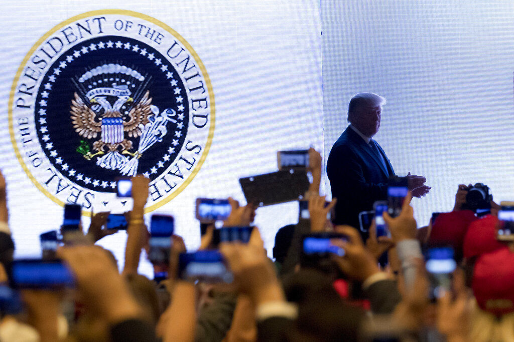Spokesman Judd Deere says officials “never saw the seal” before it was projected on a screen behind Trump as he was introduced at Turning Point USA’s teen summit on Tuesday. The real seal has a bald eagle clutching arrows in one set of talons and an olive branch in the other.
