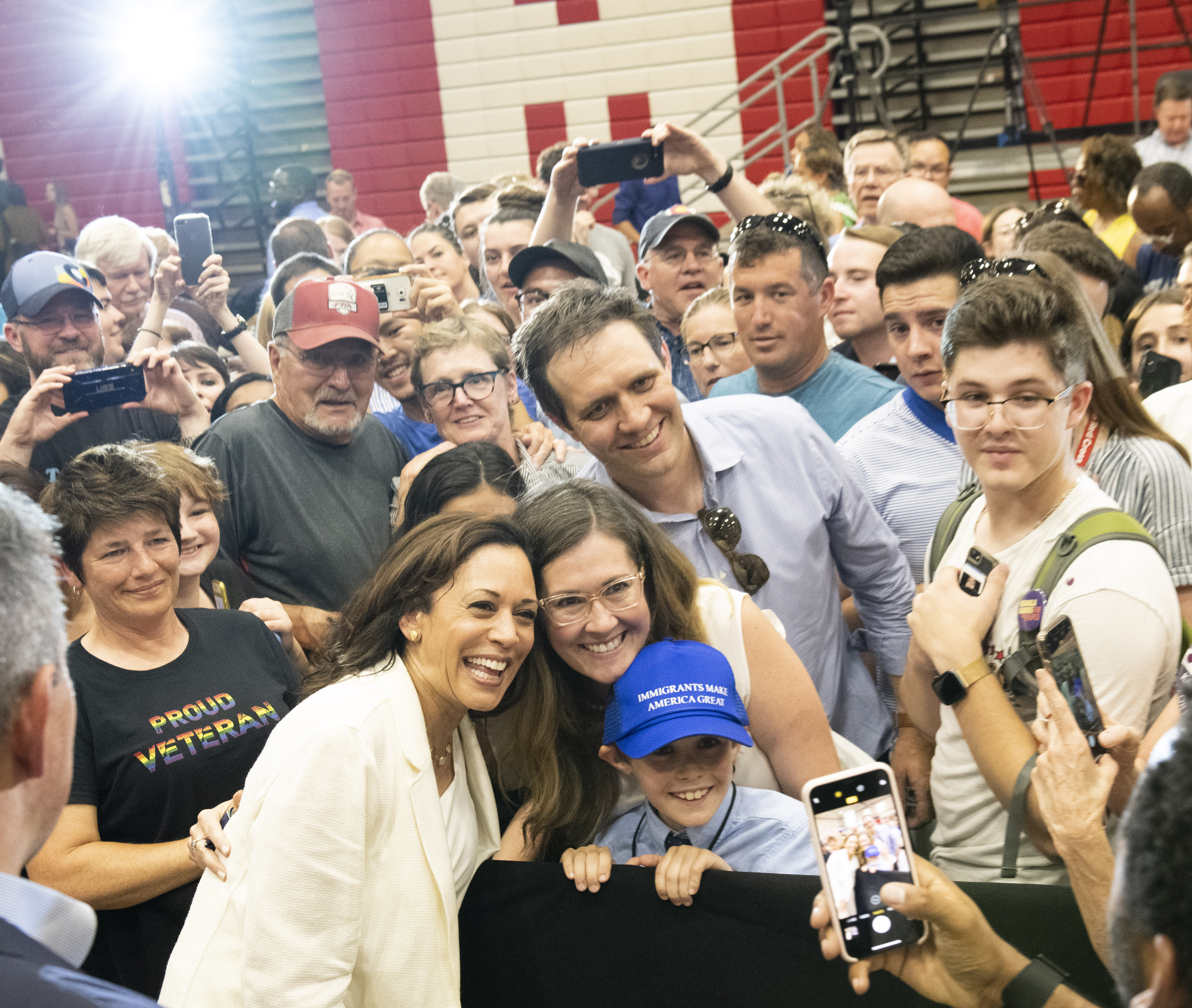After Harris finished speaking, 8-year-old J.B. Breit, wearing a blue ball cap with the slogan “Immigrants make America great,” sat on the shoulders of his father, Denver criminal defense attorney Marshall Breit, to get a better view of the candidate as she visited with supporters who crowded in front of the stage.