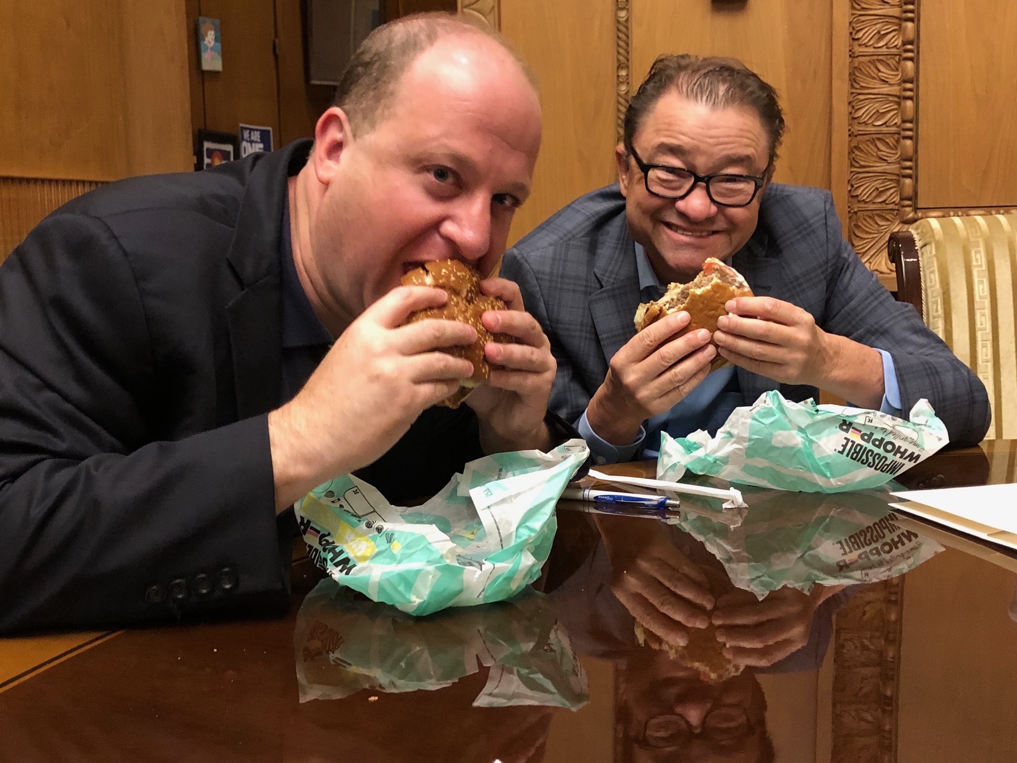 Gov. Jared Polis sees a future for Colorado with less meats and more profits, he said Thursday morning while dining on a Burger King Impossible Whopper in his office at the Capitol.
