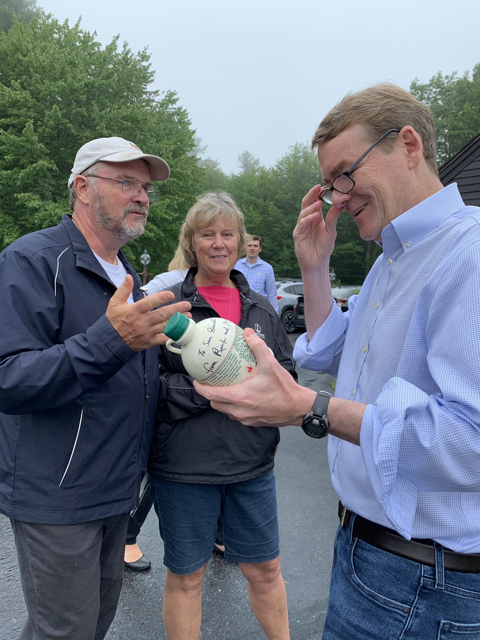 There he is examining a jug of “fantastic homemade maple syrup autographed by the sugarmaker himself” at Miller Farm in New Hampshire.
