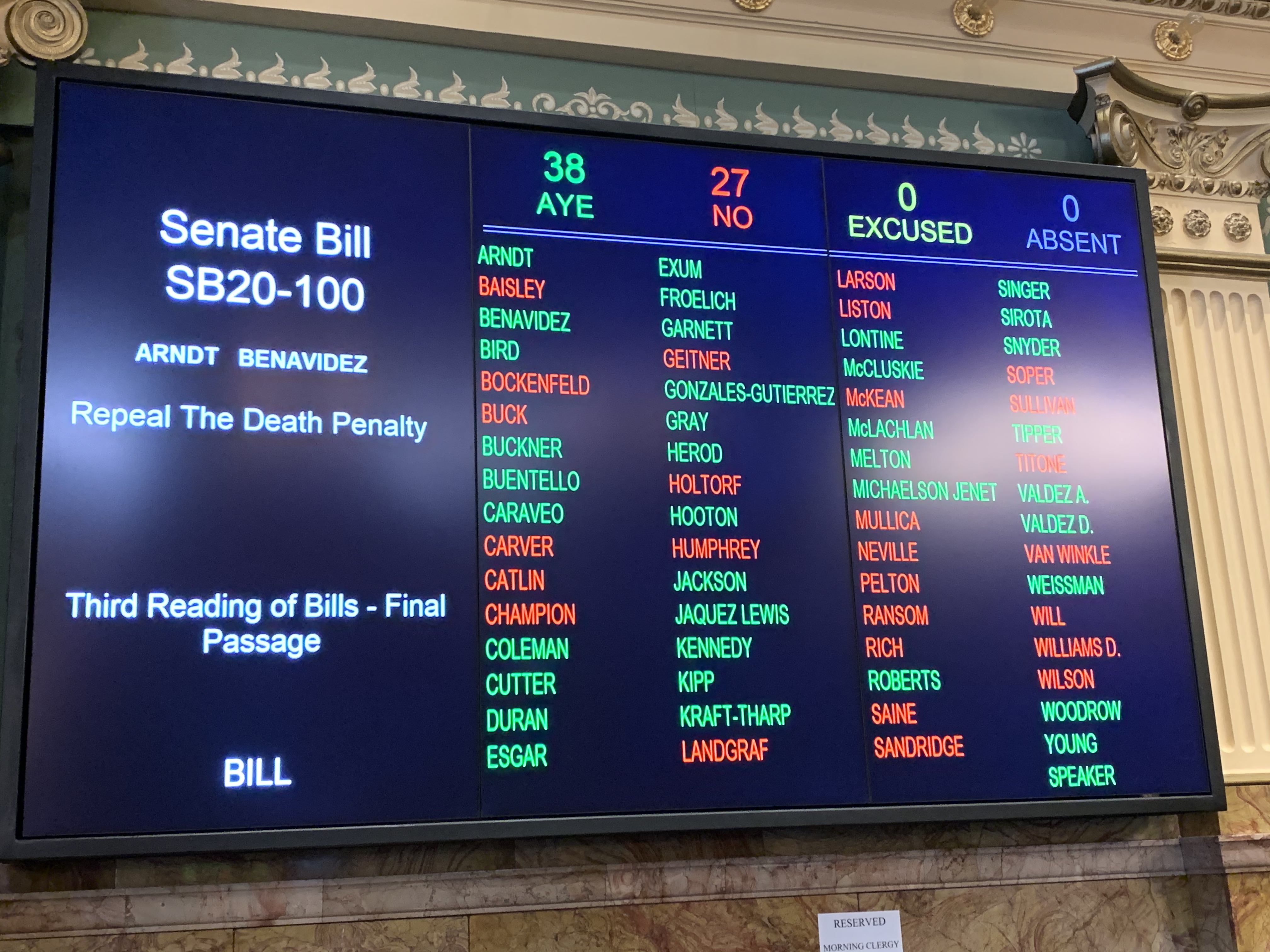 The final vote – 38 to 27 – included three Democrats who voted “no.” Gov. Jared Polis has said he will sign the measure into law, and that he will commute the sentences of the three black men who now sit on Colorado’s death row.