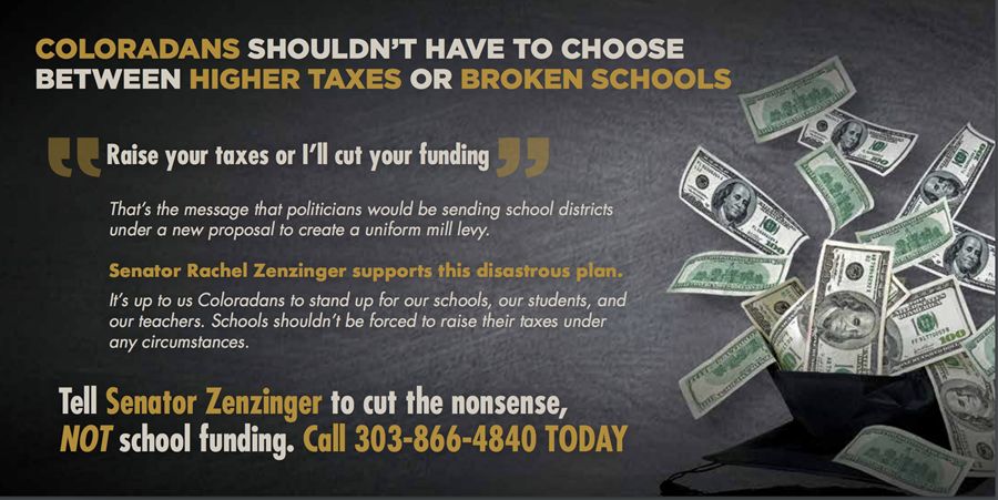 “Raise your taxes or I’ll cut your funding,” reads the mailer targeting a proposed uniform mill levy from Sen. Rachel Zenzinger, D-Arvada, for school districts. The statement is in quotation marks, but there is no indication that Zenzinger or anyone else said it.