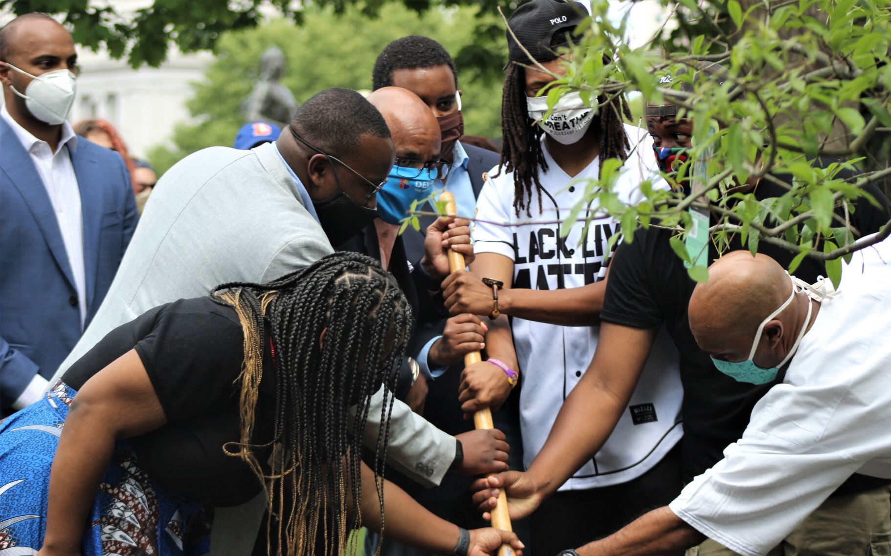 “We plant a tree today in memory of George Floyd and all those names that we have called out,” Hancock told the crowd of hundreds, “because we want it to always stand erect, tall, even taller than the 6-foot-7-inch George Floyd.”