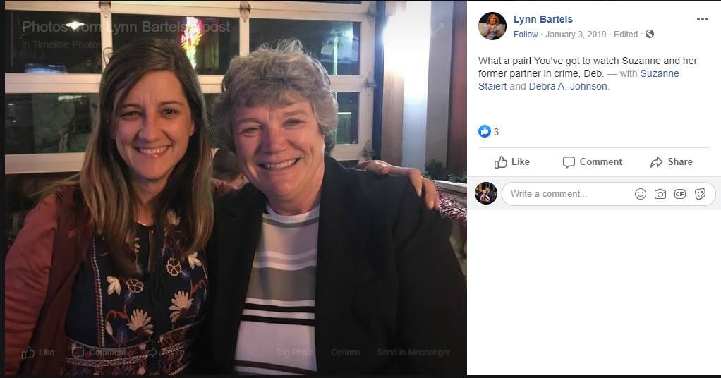 In a January 2019 Facebook post, Lynn Bartels, who worked with Staiert at the Secretary of State’s office, posted a photo of the two, labeling Johnson as Staiert’s “former partner in crime.”