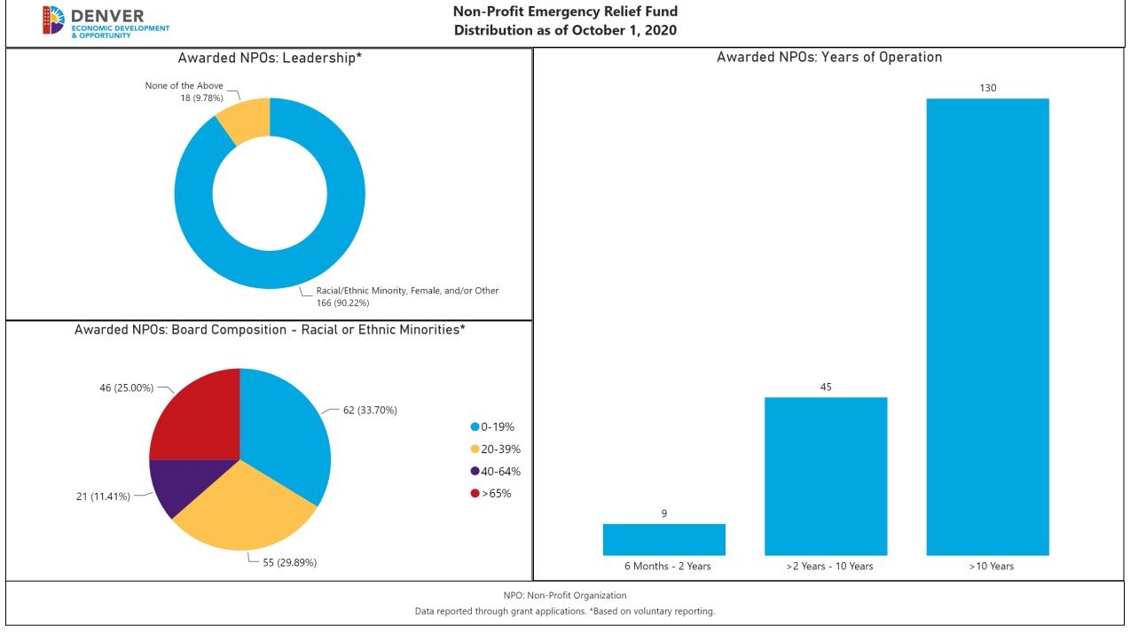 The program provides one-time grant assistance up to $15,000 per grantee. As of Oct. 1, the NPERF had completed three rounds of funding for a total of $1.8 million in grants to 184 Denver nonprofits. The majority of the grants, about 38%, were awarded to nonprofits generating a revenue of $300,000 or less annually.
