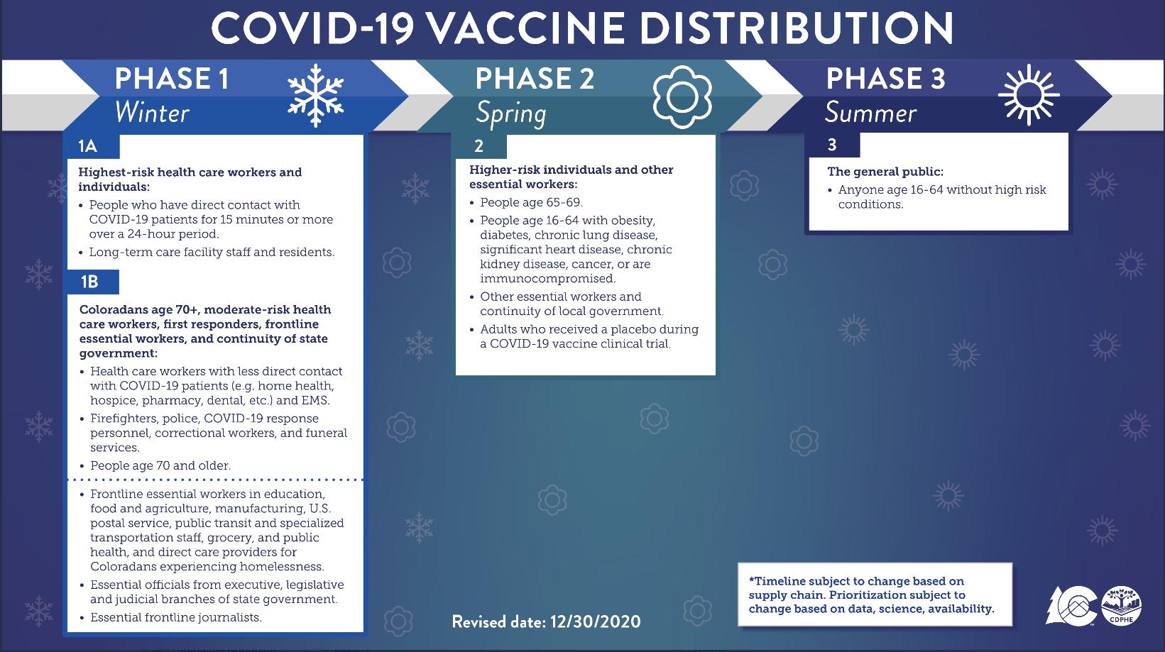 Polis announced during his press conference that vaccines are nearly completed for front-line healthcare workers and that on Thursday, Coloradans 70 years and older, and nursing home residents and staff will start getting vaccinated, known as Phase 1B. That group also will include teachers, food and ag workers, postal service employees, government officials involved in continuity of state government operations and a small sector of front-line journalists.