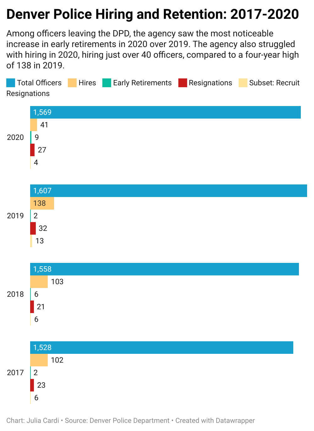 The precipitous decreases in hiring seem to be at least partially attributable to the COVID-19 pandemic. Denver originally planned two classes of lateral hires – veteran officers coming from other departments – and two classes of brand-new recruits in 2020, but once the pandemic hit, the departments only had one of each.