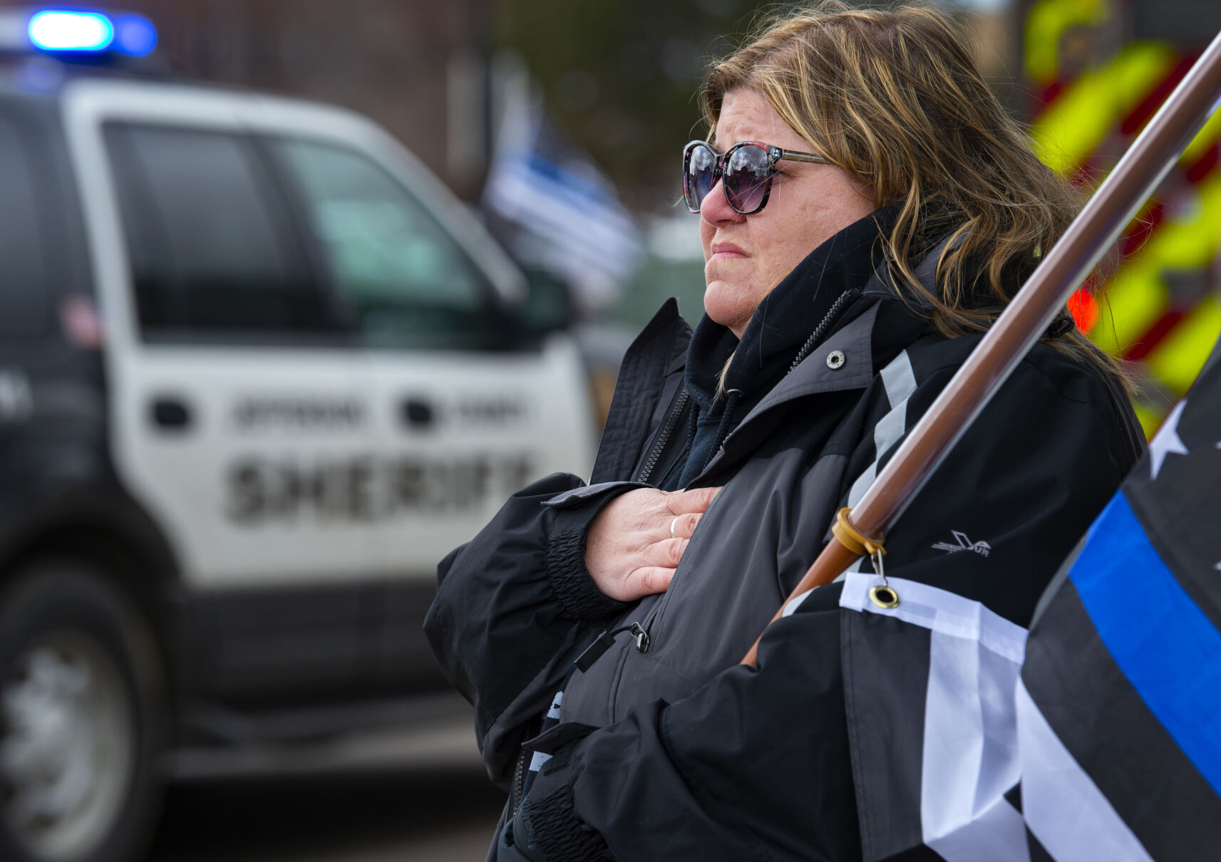 A patrol vehicle parked outside the department headquarters at 1805 33rd St. has been turned into a memorial for Talley and he other victims, with flowers, cards and posters piled high.