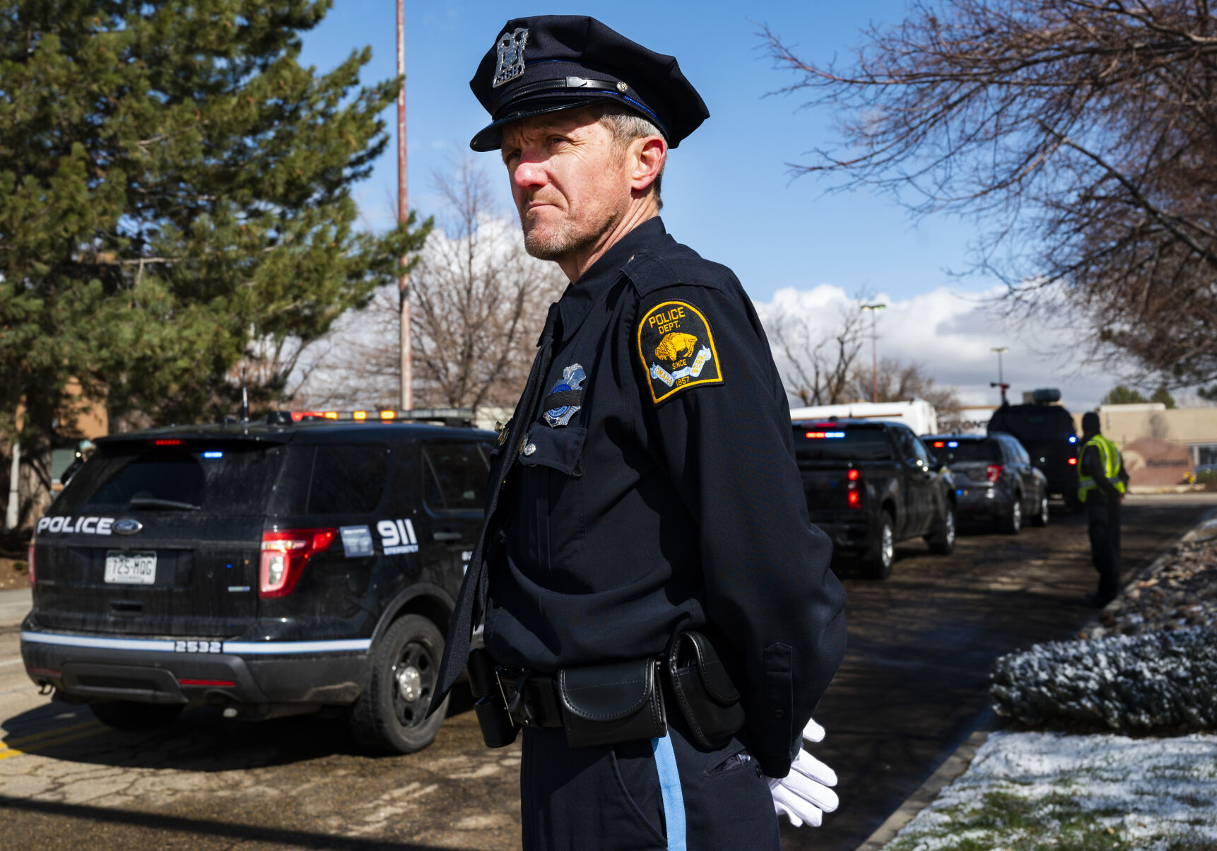 A law enforcement procession of more than 500 vehicles, according to the Boulder Police Department, brought Talley’s flag-draped casket from Thornton to the church in Lafayette mid-morning, arriving about 10:30.