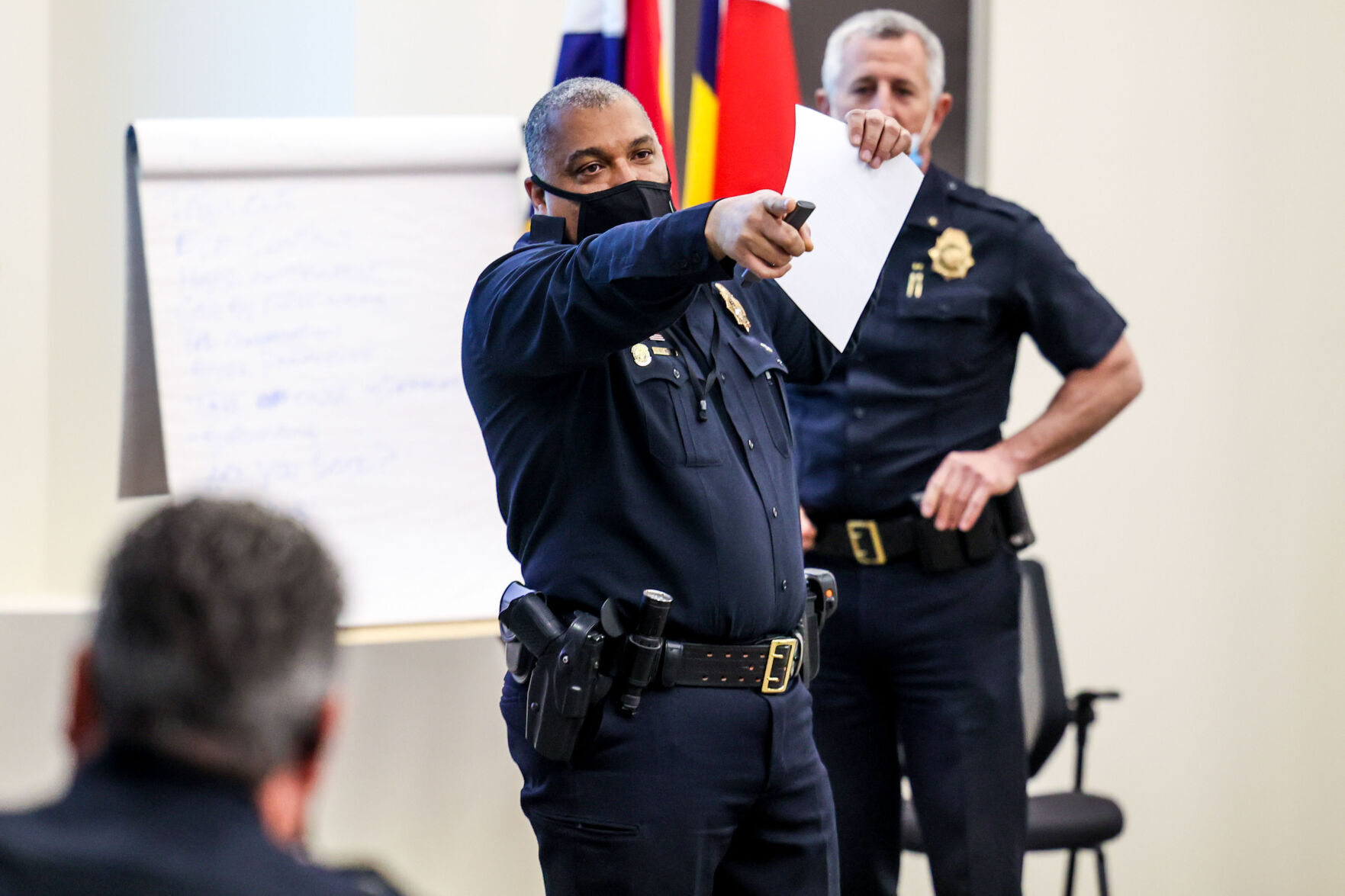 The DPD leaders participated in a few role-playing scenarios during Friday’s training. In one, an officer would talk to another about personal stresses seeping into their fellow officer’s work and coax them to open up. In another scenario, one confronted a more experienced officer about an omission in a use-of-force report.