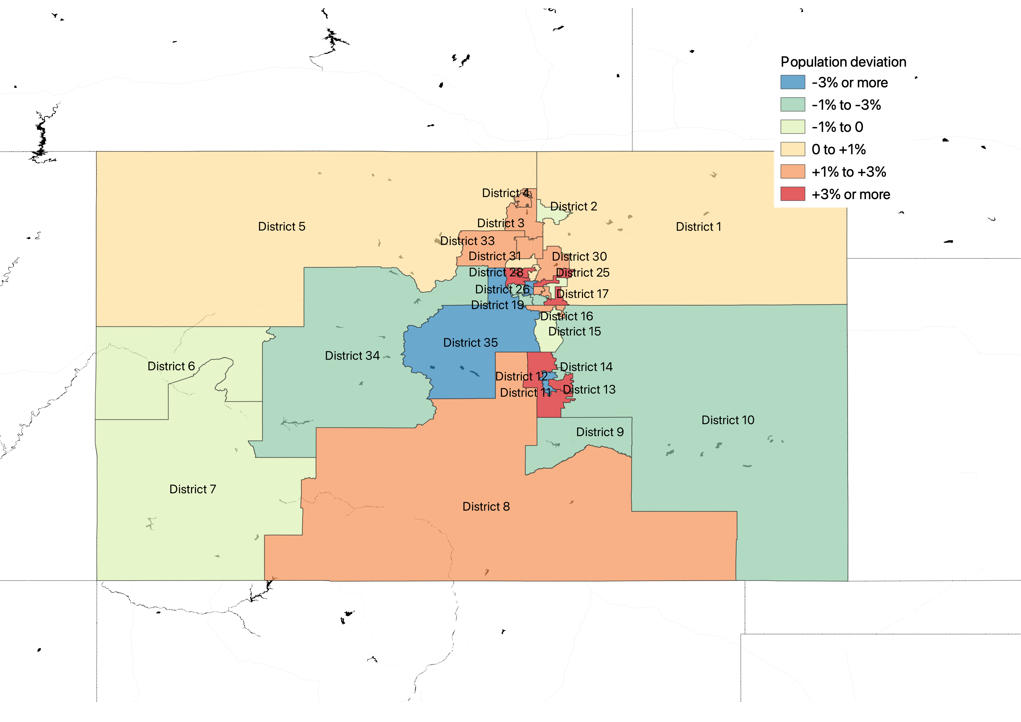 With the release of the official census data, it’s possible to see exactly where the commissions’ maps have districts with too many people or too few people.