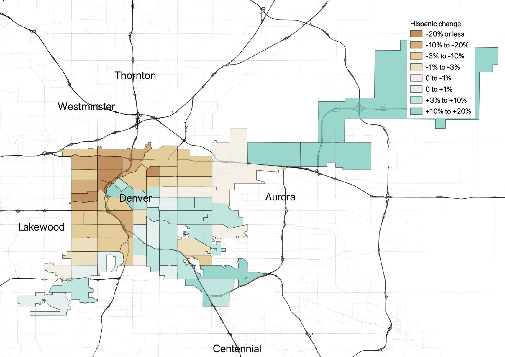 Census data analyzed by Colorado Politics shows that in the three neighborhoods, the strongest growth was among white residents. In the three neighborhoods together, roughly 4,000 Hispanic residents left while roughly 7,000 white residents moved in, pushing the cluster of neighborhoods from roughly 42% Hispanic in 2010 to 23% Hispanic in 2020.