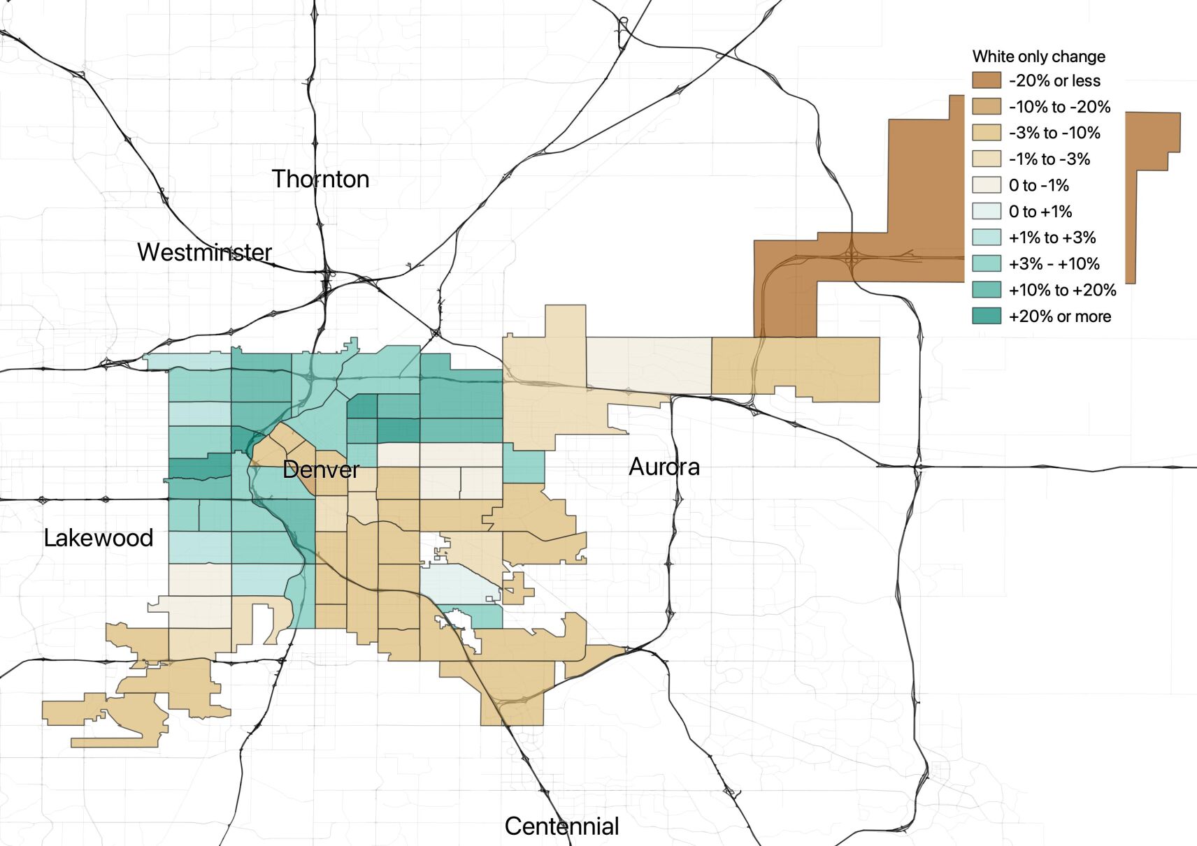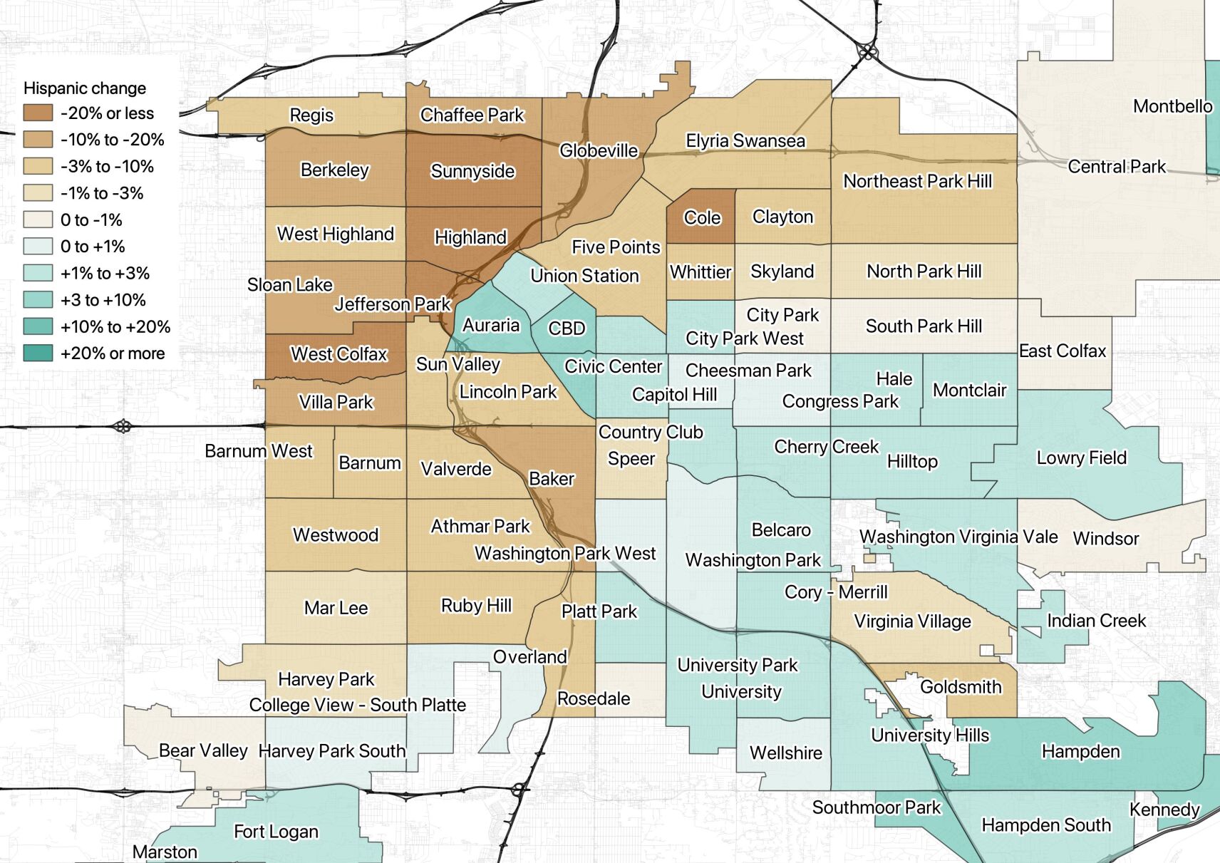 North Park Hill and Whittier went from a majority Black and Hispanic to a majority white.
