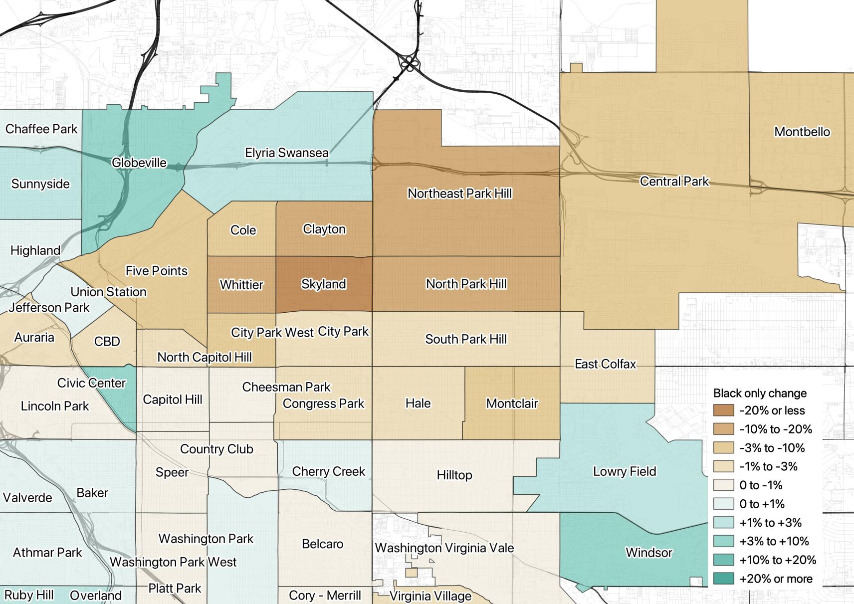 The adjacent neighborhoods of Five Points, Cole, Whittier, Clayton, Skyland, North Park Hill and Northeast Park Hill, when counted together, saw 3,600 Black residents leave and 14,000 new white residents move in, making the total Black population drop from 28% to 17% in the past ten years, while the white portion of the same neighborhoods went from 33% to 49%.