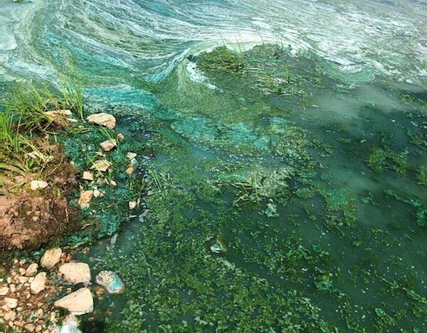 The blue-green algae bloom is actually bacteria, according to pollution control agencies. The blooms prosper in areas with warm water, an increasing issue with global climate change.