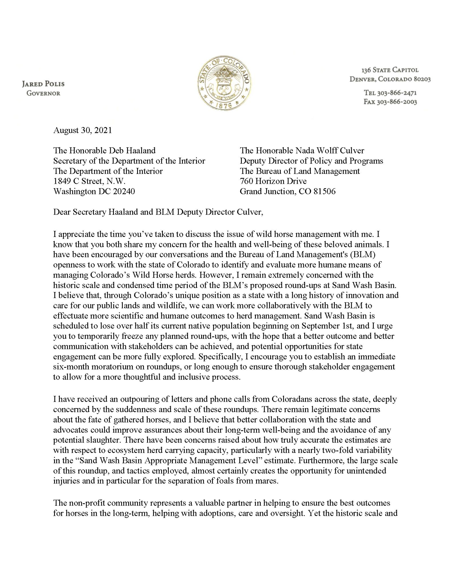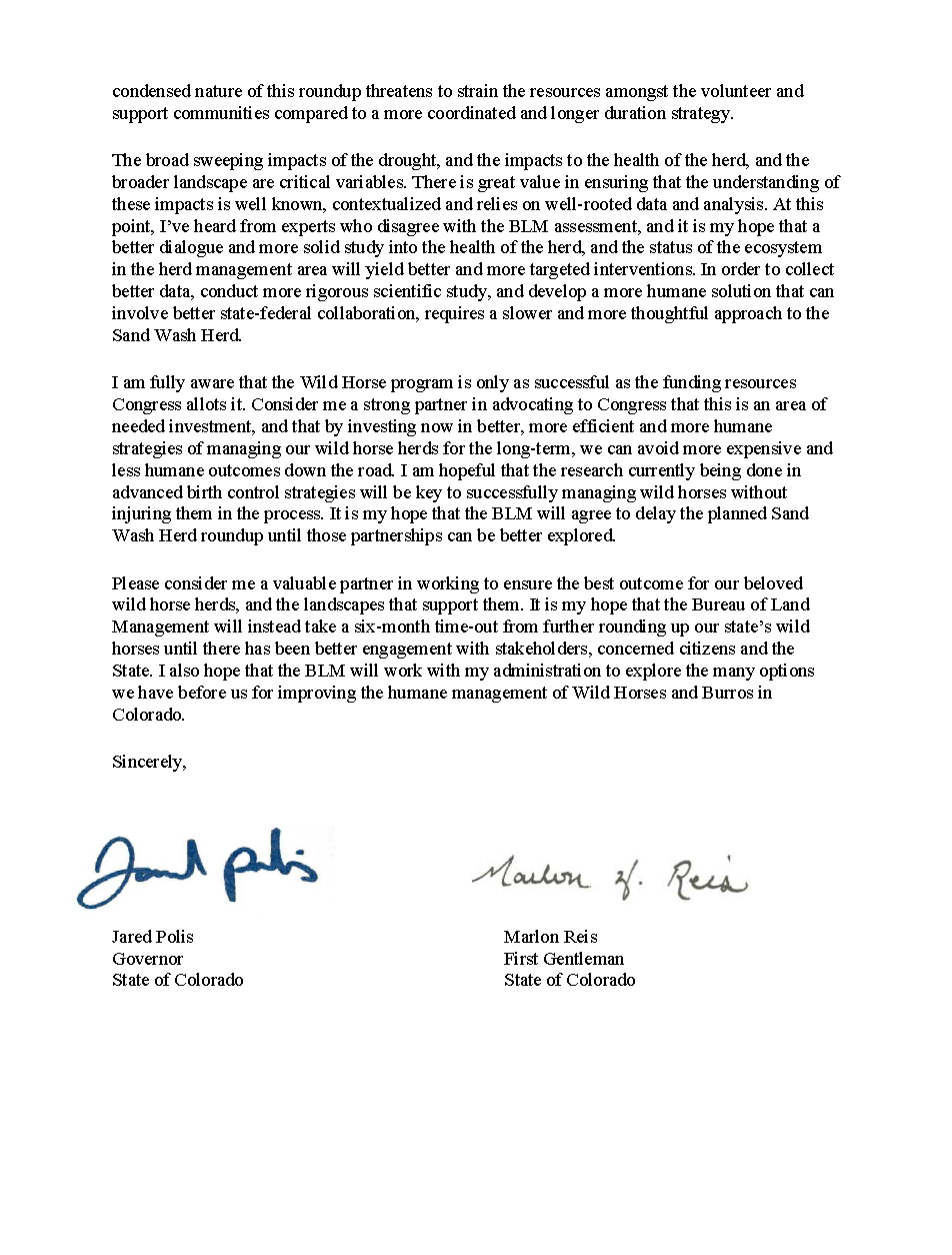 In the past 24 hours, Polis and Reis sent a two-page letter to Secretary of the Interior Deb Haaland and Nada Wolff Culver, deputy director of policy and programs at the BLM, asking them to freeze the planned roundup at Sand Wash Basin in Moffat County.