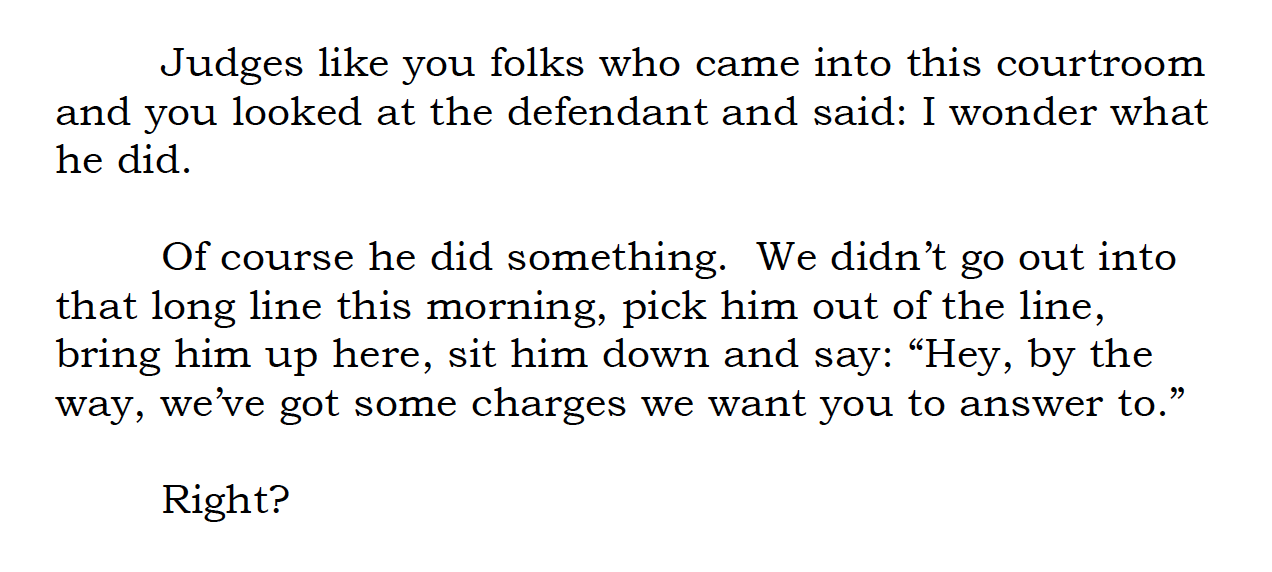 “Let me tell you something, folks. [The defendant] did something. I’ll tell you that much right now. He did something. All right?” Wasserman said. “We didn’t just go out on the street in the front of the courthouse this morning and say, ‘Hello … it’s your lucky day.’ OK? Of course, he did something.”