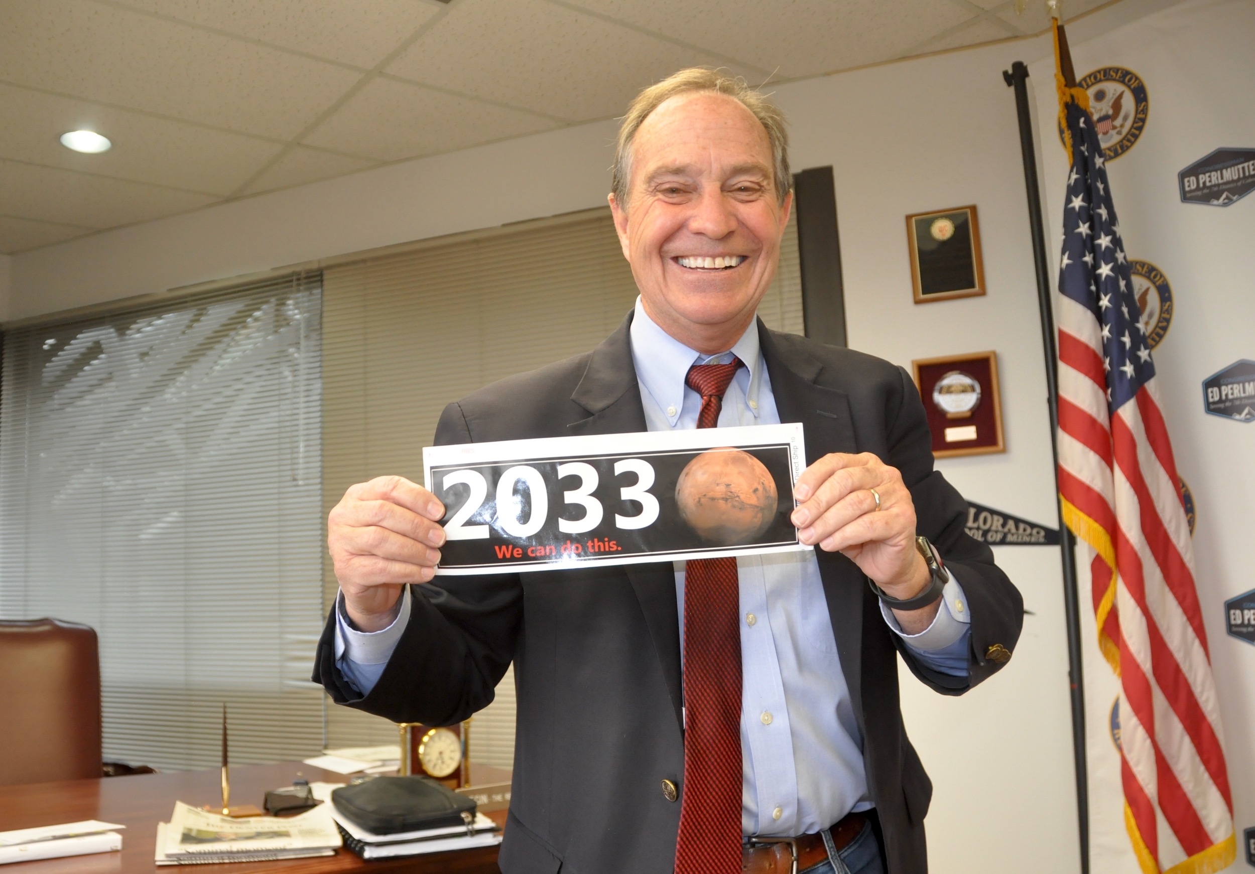 Behind his desk, which overlooks much of the 7th Congressional District – Adams and Jefferson county suburbs north and west of the metro area, from Commerce City to Westminster and Arvada to Lakewood – is a bumper sticker featuring a photograph of the planet Mars, the date 2033 and the phrase, “We can do this.”