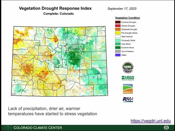 That largely means evaporative demand – which shows the “thirst of the atmosphere” – has been normal or even a little below normal. Western Colorado is the exception, a region of the state where it’s drying out and putting stress on vegetation.