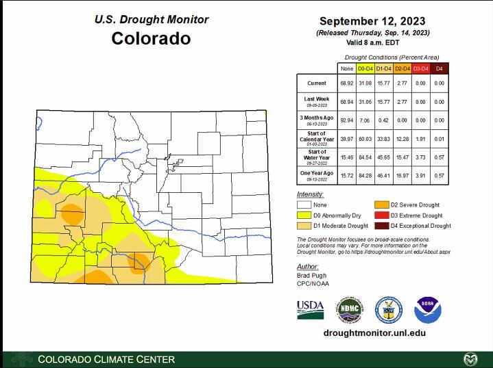 About 31% of the state is in some level of drought, but at the lowest levels. The affected areas are entirely in southwestern Colorado, and Bolinger said those conditions developed since early to mid-July. But that’s an improvement from where Colorado stood at the beginning of the water year last Oct. 1.