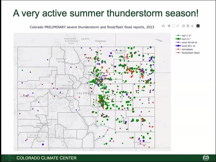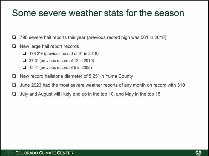 The 310 reports included thunderstorms and flash floods, as well as active hailstorms with 2-inch diameter hailstones. July and August look to be in the Top 10 for record weather, she added.