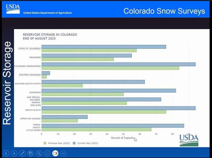 Many reservoirs are full or nearly so after years of below average levels. In some reservoirs, water levels are at nearly 10-year highs, he said, such as for the reservoirs along the South Platte.