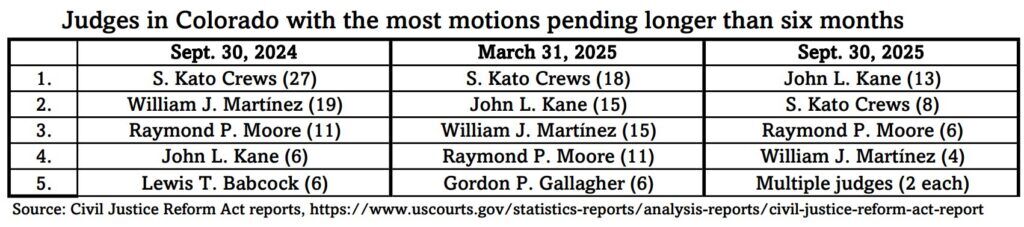 Colorado’s federal trial judges collectively had 37 motions in civil cases that had been sitting on their dockets for at least six months without a ruling, as of Sept. 30.