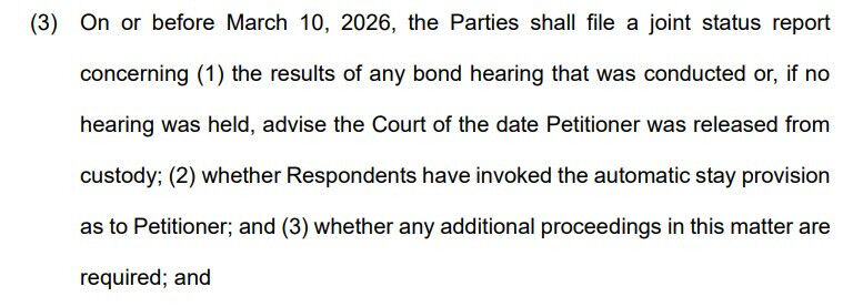 • Judge Nina Y. Wang has also started to instruct the government to indicate whether it will invoke the “automatic stay” to keep someone detained even after an immigration judge finds them suitable for release: