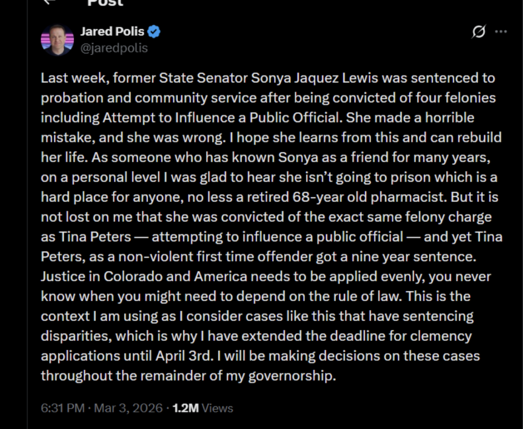 In his post on X, Polis added, “But it is not lost on me that she was convicted of the exact same felony charge as Tina Peters — attempting to influence a public official — and yet Tina Peters, as a non-violent first time offender got a nine year sentence.”