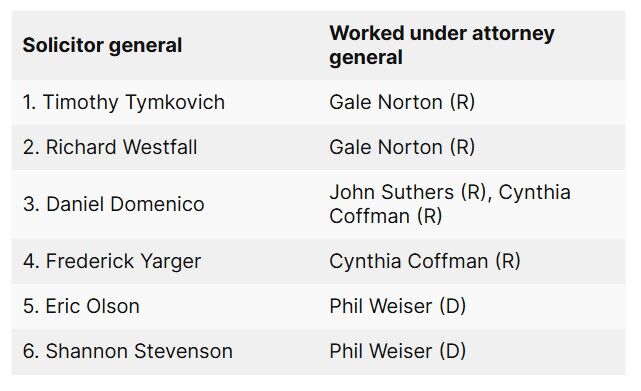 In the early 1990s, “the role was to represent the cabinet officers, basically, in legal matters. There was no legal policy. There was no association with other states. There was no legal policy advancement. It was very much a dry and desiccated position,” said Judge Timothy M. Tymkovich of the U.S. Court of Appeals for the 10th Circuit. “And (Attorney General) Gale Norton’s vision of it, and one that I subscribed to, was to open it up as an innovative actor within the state of Colorado and a player in the national scene in a capacity that hadn’t been thought of before this era.”